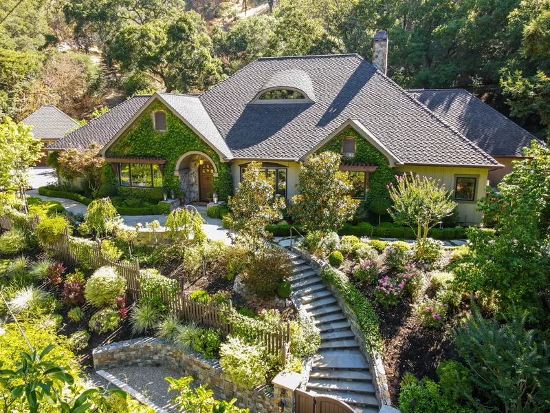 This Happy Valley masterpiece, on a traffic-free cul-de-sac, was built as the personal residence of its noted designer. Outdoor dining areas survey the magnificent terraced garden and adjoin a waterfall feature and firepit. A path from the garden leads to the incomparable hiking and views in Briones Regional Park. Inside, the home features a chefs kitchen with custom cabinetry, marble and granite counters, top appliances, a breakfast bar, and garden views; two fireplaces with stone mantles generating warmth throughout; custom window treatments and light fixtures; SONOS sound system inside and out; smart televisions; hand-scraped oak flooring; elevated wood-beam ceilings; thick walls and double-paned windows; two offices with built-in features; top bathroom fixtures and tiles; a great room adjoining a granite and tile wet bar; distinctive custom railings; two tankless water heaters; garages for four cars; ample cabinet and storage spaces; hot tub; and an en-suite bathroom in most bedrooms.
