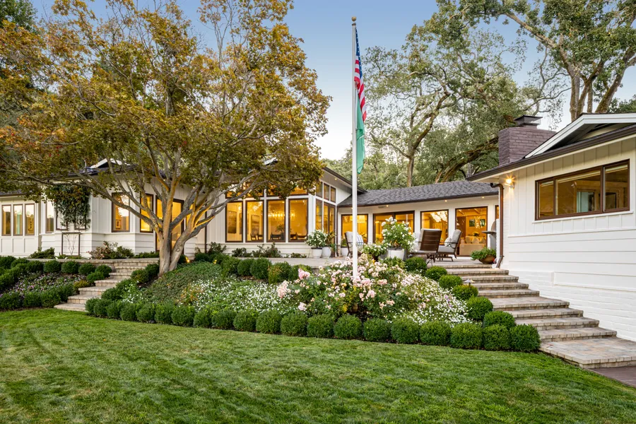 The driveway encircles mature valley oaks. From the front door the welcoming and open Great Room beckons, and that room truly is great: The area, over immaculate engineered oak hardwoods, seamlessly blends the remodeled kitchen (with exceptional Taj Mahal quartzite countertops and Wolf, SubZero, and Miele appliances); a butler’s pantry with more elite appliances; a walnut-countertop bar (with a wine refrigerator) seating at least five; an exceptional family room (under elevated...