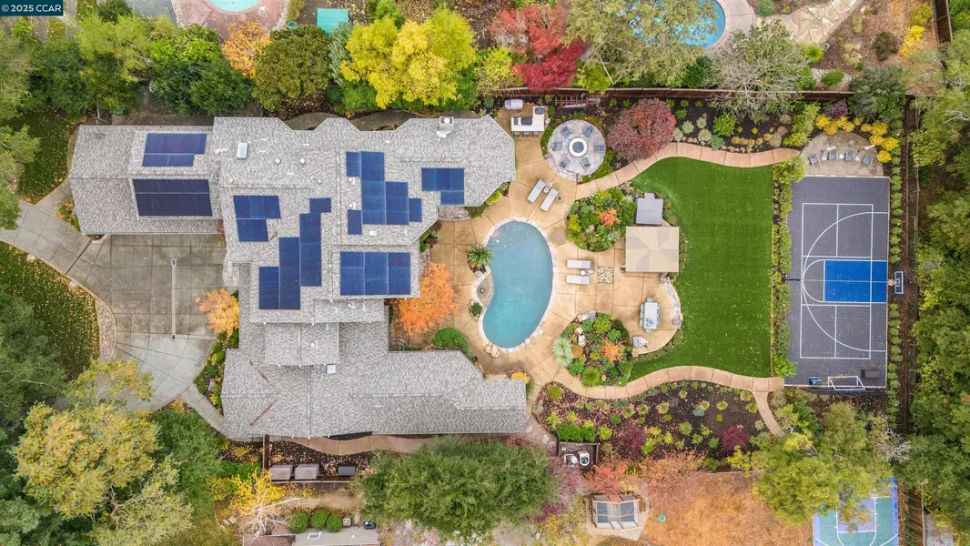 Located in the heart of Westside Alamo, this stunning estate features abundant natural light, soaring ceilings, designer renovations, and FULLY OWNED SOLAR. Situated on a flat, tranquil lot in a sought-after neighborhood, the backyard is a private oasis framed by towering redwoods and includes a sparkling pool, outdoor kitchen, sport court, and a firepit with a cozy entertainment area. Inside, the main level boasts a private wing with four bedrooms and a versatile bonus space, while the upper level offers an additional ensuite bedroom and a luxurious primary suite. Upstairs, you'll also find a light-filled, professionally designed home office and private gym, with convenient access via a back staircase. Close to top-rated SRV schools, parks, the Iron Horse Trail, and shops-this is more than a home - it's a lifestyle!