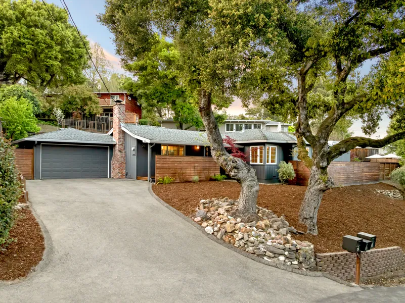 Nestled on a quiet street just down the road from Wagner Ranch Elementary School, this charming mid-century modern home features three spacious bedrooms and two beautifully appointed bathrooms. Step into the welcoming, large living room, with its stunning wood-burning fireplace, peaked beamed ceiling and natural light from skylights. Gorgeous refinished red oak hardwood floors flow seamlessly into the adjoining family room and dining area. This home is designed for indoor/outdoor entertaining, with direct access from the newly updated kitchen to a peaceful courtyard, a lush grassy play area, and an inviting deck. Welcome guests outside, amidst Japanese maples, pear, apple, and lemon trees. The principal suite offers a generous walk-in closet with built-in drawers and features floor-to-ceiling sliding doors that lead directly to the serene backyard. The additional bedrooms provide lovely ...