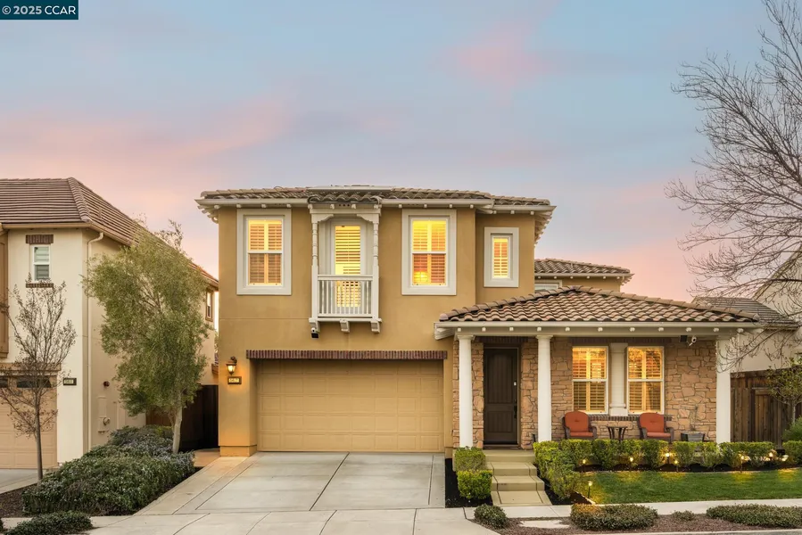 Welcome to this stunning East facing home in Alamo Creek with owned solar and custom light fixtures throughout. This floorplan showcases a sought after main level bedroom and full bath, perfect for generational living or overnight guests. This home also showcases a formal dining room with access to an enclosed courtyard for indoor/outdoor dining. The beautifully updated kitchen with built-in stainless steel appliances opens to a sunny breakfast nook and the spacious family room. Discover a built-in workspace by the staircase, perfect for working from home. The primary bedroom suite has a spa-like bath featuring new a walk-in closet, soaking tub, walk-in shower and dual sinks. The upper level is complete with a bonus loft, 2 secondary bedrooms and a shared hall bath. The low maintenance yard offers spacious patios and lush lawn. Walking distance to Creekside Elementary, parks, community clubhouse and pool and just a short drive to the Blackhawk Plaza.