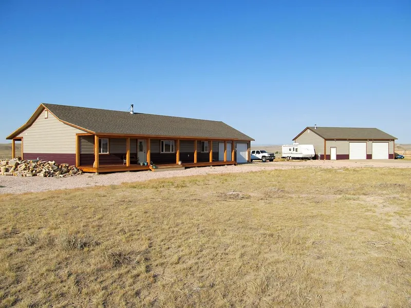 Enjoy peaceful country living on 42.78 acres with room for horses or livestock conveniently located just three miles off of Highway 18-20 between Shawnee and Orin Junction. This property features a 3,584 sq. ft. custom home, built in 2011, with three bedrooms and two full baths on the main level and three bedrooms and one full bath on the lower level. The interior of the home open, warm, and inviting with knotty pine ceilings, wainscoting, and half-log walls. The kitchen has custom hickory cabinets and new appliances. The kitchen and dining room have tile floors with carpet floors throughout the rest of the home. The attached 768 sq. ft., two-car garage enters the house though a large laundry room which has plenty of storage. There are full covered redwood porches along the front and back with beautiful mountain views off the back dec...