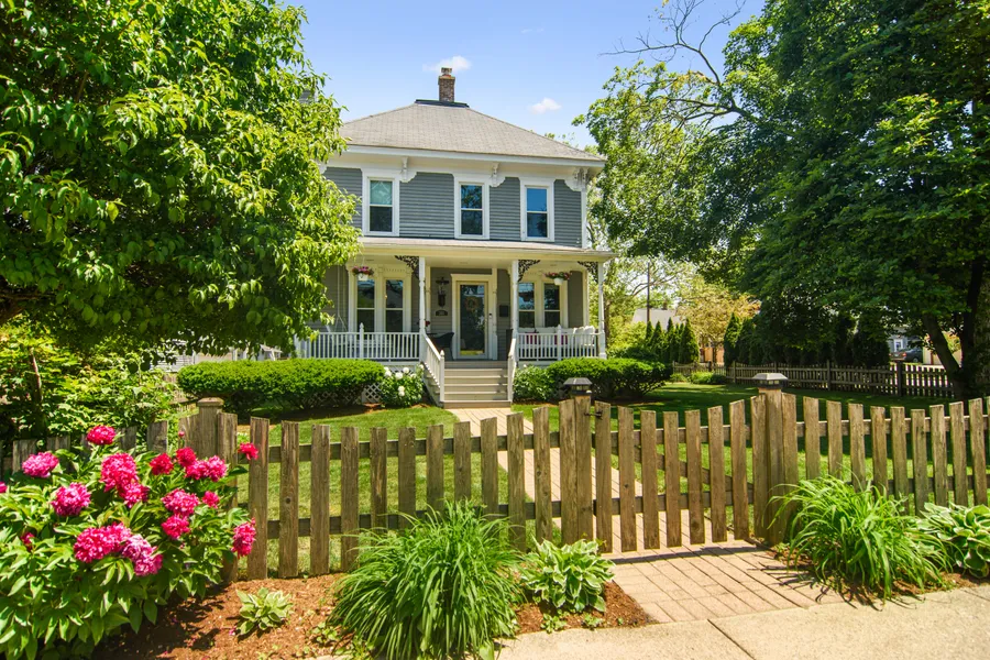 A picket fence, charming front porch, beautiful landscaping and 'walk everywhere location' provide an idyllic setting to welcome you home . The impeccably preserved vintage finishes combined with modern updating perfectly blend nostalgia with today's conveniences and lifestyle. Main floor offers a flexible floorplan with a formal living room opening to the family room, both with gleaming restored historic millwork, nine foot ceilings, vintage hardware, and beautiful hardwood floors. The kitchen has lots of light (natural and custom), glass-faced cabinets, a farmhouse sink, and granite countertops, which opens to the vaulted ceiling dining room and spacious wrap around deck. There's a main floor laundry room and a stunning fourth bedroom, with fireplace, presently used as a perfect office, with adjacent newly updated full bath featuring a steam shower. Upstairs boasts two bedrooms which share an updated full bath and a gracious master suite including a spa tub/shower, dual vanities, and a large walk-in closet. The basement provides great storage, a game/recreation room and playspace. The outdoor living space is amazing too, with a yard filled with peonies, hostas, day lilies and lush grass, surrounded by a picket fence and beautiful trees. The front porch and large deck are perfect for relaxing or entertaining. There's a paver driveway and a two car garage, all within the fence, making the yard perfect for pets too. Walk to school, shopping, dining, playgrounds and the Metra train. Enjoy this slice of history, while basking in the luxuries of a fully updated home.