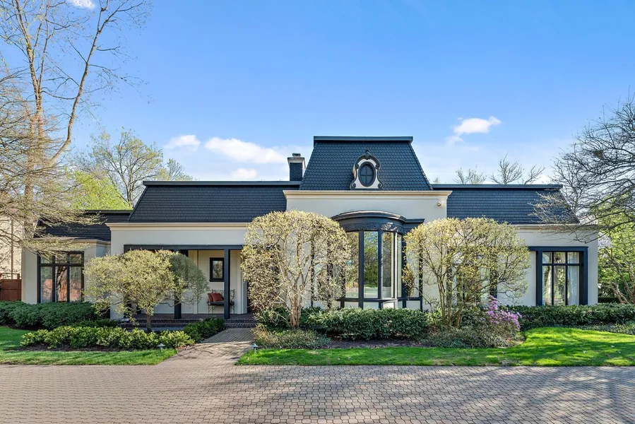 This ranch style contemporary French home, boasting one of Winnetka's most prestigious addresses, is a one of a kind work of art! Designed by Norman Yeretsky and built in 1974, this 7000+ square foot home is situated on 1.18 acres facing the 12th green of Indian Hill Country Club. The sun-drenched foyer/gallery with terrazzo floors and a wall of windows overlooking the pool leads to a dramatic living room with impressive 14' beamed ceilings, ornamental moldings, hardwood floors, an antique French marble mantle over the gas log fireplace and truly stunning views of the golf course. The living room leads to a huge step-down garden/dining room with high vaulted ceilings, a skylight, exposed brick and terrazzo floors. The fully equipped kitchen has an eat-in area and tons of cabinets plus an oversized walk-in pantry. Off the dining room is a small, intimate gathering space and a tiled wet bar with sub-zero ice maker and built-in wine refrigerator. The den between the bar area and the family room lends itself to a number of uses, including in-home office, at-home learning, playroom or casual sitting room. The enormous family room overlooks the pool and backyard. A fourth bedroom, in this wing, has a private exterior entrance and a full, updated bathroom. While currently used as a game room, it was originally a two-room suite designed for live-in's and could easily be converted back to this configuration making it great for multi-generational living, a home office, or you name it. The other three bedrooms are on the opposite side of the home. Enter the main bedroom wing through beautiful French architectural doors just off the foyer. First, pass the black and white granite powder room with architectural detailing. The primary bedroom suite is a giant octagonal bedroom with an antique marble mantle over a gas logged fireplace and is flanked by two separate private spaces. One side includes a study/dressing room with floor to ceiling shelves, a walk-in closet, built-ins and a private bathroom. The other side has a lovely sitting room/dressing room, built-in window seats, a walk-in closet, floor to ceiling shelves and drawers, a built-in dressing table, a marble bathtub, and a walk-in shower. Two more generous bedrooms are down the hall as well as a shared bath and access to the pool area. The backyard includes a massive blue patio for social gatherings as well as a pool with a diving board and a slide. The home has a three-car attached and heated garage complete with extra cabinet storage. The paver driveway has plenty of parking for guests. This home is in Harper Elementary and award-winning Wilmette District 39. This home is perfect for so many buyers and is like living in a resort every day.
