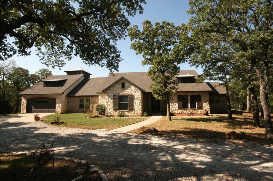 Built in 2002, the homes two-story design exudes personality, both inside and out. The exterior construction is a tasteful blending of brick, stone and wood and the interior is enriched with attractive earth-tone colors, lightly textured and faux finished walls, pressed tin ceilings and custom finished millwork. The living area, kitchen, dining, study, three bedrooms, three baths and utility room are all on the main level. Upstairs is a rustic game room with a bar, sink and fridge, a half bath and an outdoor deck with stairs leading down to a spacious main level covered patio and outdoor sitting area with water feature, shade trees and hot tub. To literally top everything off, above the game room is a cool third level observation room with wrap around windows providing panoramic, 360-degree views. The home sits about three-quarters into the property at its highest point, where it becomes more wooded with fabulous views that are only limited by the beautiful oak trees that enhance the quiet, secluded atmosphere surrounding it.