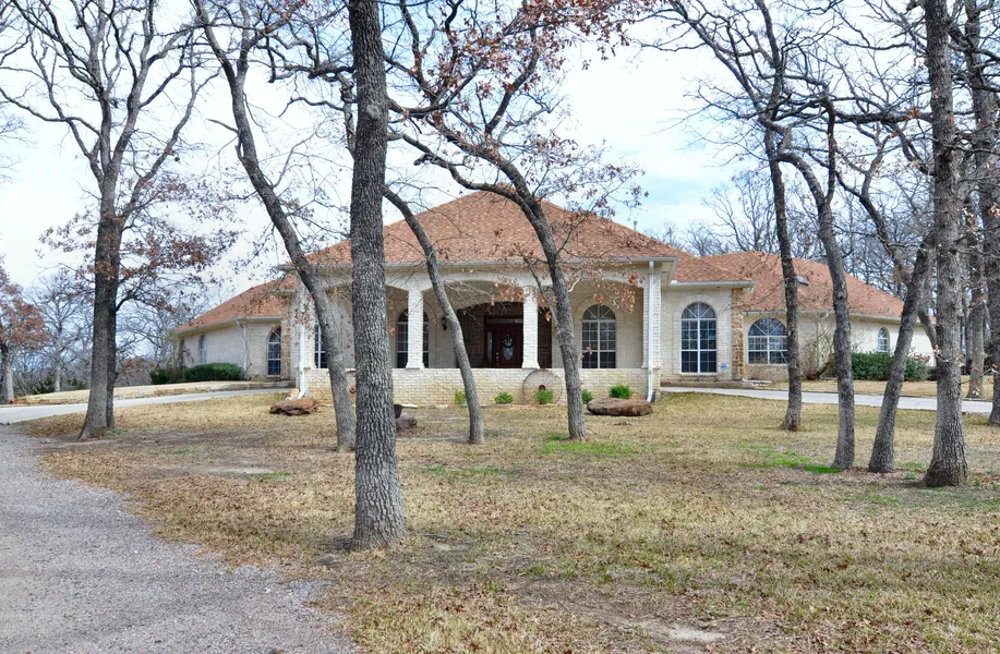 Elegant country manor surrounded by five wooded acres in the prestigious Ranch Subdivision near the Mountain Springs Community within the highly desirable Pilot Point ISD. This luxurious one story features an island kitchen with granite counter tops, tumbled marble back splash and a gas cook top; a sunny breakfast area that looks out at the pool; two living areas with scraped hardwoods; a lovely separate formal dining room; an oversized master suite with a private study and exercise room; a large fifth bedroom that could be used as a game room; and a craft or flex room. The outdoor oasis includes a sparkling pool, spa, covered patio and an outdoor kitchen and fireplace perfect for entertaining. There is also a large workshop, garden shed and a stocked fish pond on the grounds. The property is fenced for horses which are allowed (1 large animal per acre). Please note that the price reduction was primarily due to removing 6.05 acres of adjacent property that is platted separately from the listing. This additional acreage is negotiable. Seller does not own any minerals. HOA dues are $100/year. Other information; Mountain Springs Water, propane central heat, Cooke County Coop Electric, foundation is post tension.
