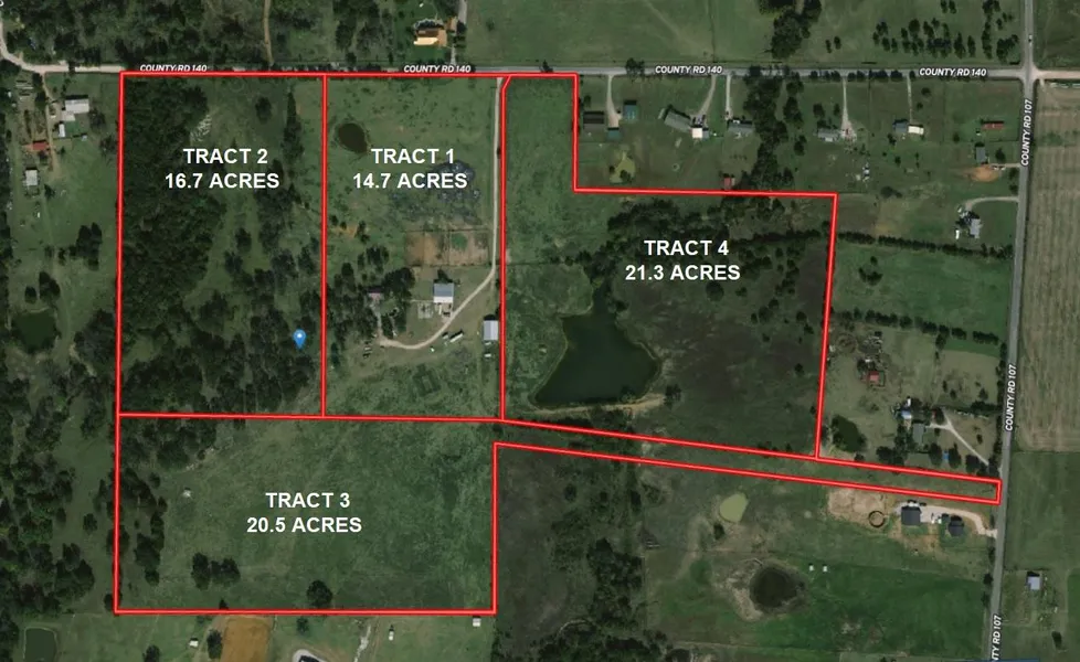 REAL PROPERTY: 73.2 acres divided in 4 Tracts. 1084' 3 bedroom, 1.5 bath home built in 1990. Gated entry, Workshop with roll up overhead doors and storage building. There's a 2 acre pond, another small pond, nice mix of lush pasture and mature trees, fenced and cross fenced. Great location situated just off Hwy 82 on CR 140 with the privacy of country living with all the convenience offered by the nearby towns of Whitesboro and Gainesville. Easy access byway of Hwy 82 to I-35 to the West and Hwy 377 to the East. .