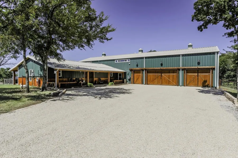 Picturesque 25.8 ac North Texas Horse Ranch! The 3,028 sf Barndominium, renovated in 2019, has loads of character from its antique tin back-splash to its handmade sliding barn doors. The beautiful 2 story 3B 3B home boasts custom soft close kitchen cabinets, a massive (9x7) island, hidden safe-room, an oversized laundry room, 3 plus car garage and so much more just minutes from the lake! Travel the chip sealed drive to the 8 stall show barn with runs, waterers, tack room, wash rack, topped off with furnished apartment with full kitchen and bath. Enjoy Cross fenced pastures with heated waterers, loafing sheds, 6-horse walker and round pen. Don't miss out on this piece of paradise in this sought after area!