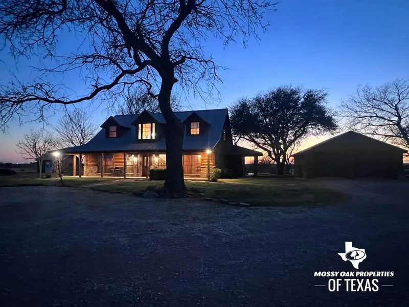 The house is 2,367 sq feet with Weatherford Stone and white pine D log exterior. Large cedar porch posts for the 816 sf of porches on 3 sides of the home with solid wood tongue & groove pine soffits. A fenced back yard keeps the pets and little kiddos from wandering off too far. The house has 2x6 exterior wall construction on 16" centers, with 2x4 interior wall construction. A 23' tall ceiling welcomes you into the foyer, as well as in the living room. Solid pine tongue & groove walls and ceilings in the living room, with tongue & grove wainscoting throughout much of the rest of the house. All of the interior doors are sold wood, with all but the closet doors being 36" wide. An office with solid wood & glass double doors could easily be a fifth bedroom, as it also has a large closet. Downstairs, you will find the office, a bedroom, a full guest bathroom, the master bedroom and bath, living room, kitchen and utility room. Upstairs are two identical bedrooms and a third full bathroom. Large tile in the foyer, bathrooms, kitchen and utility room, with carpet in all bedrooms. LOTS of big windows to take full advantage of the beautiful countryside. The wood-burning fireplace is the focal point of the living room, with natural Weatherford stone going all 23' up to the ceiling, and a built in blower to distribute the heat throughout the house. During the snow storm of 2021, this fireplace kept the house nice and toasty even without electricity. The adjoining kitchen gives an open floor-plan to the home with a large island with bar sink, granite counter tops, and custom oak cabinets. New stainless steel GE appliances include a side by side refrigerator, double oven, smooth top stove, built in convection microwave, and a dishwasher.