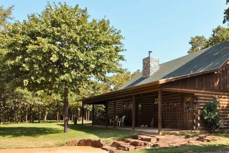 Immaculate log home nestled in hundreds of mature Oak trees on approx 5.5 acres near Lake Kiowa. Highlights include stone fireplace, high ceilings, 2nd living area upstairs could be game room or 4th bdrm, open living and dining provides multiple furniture arrangement possibilities. Large shop w 3 overhead doors, workroom, half bath, separate septic, and a separate water well for irrigating yard. A secluded paradise! Buyer to verify all info.