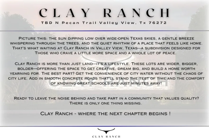Discover Clay Ranch, a brand-new community in Valley View, TX, set for completion in April 2025. This exclusive subdivision offers spacious half-acre and acre lots with city water, private septic, high-speed internet, and co-op power. Designed for both convenience and quality, the neighborhood will feature concrete roads and minimal HOA restrictions, with annual dues of just $100. Ideally located with quick access to I-35 and within the highly regarded Valley View ISD, Clay Ranch provides a peaceful setting with generous lot frontages, perfect for building a wide, custom home. Secure your spot in this exceptional community today!