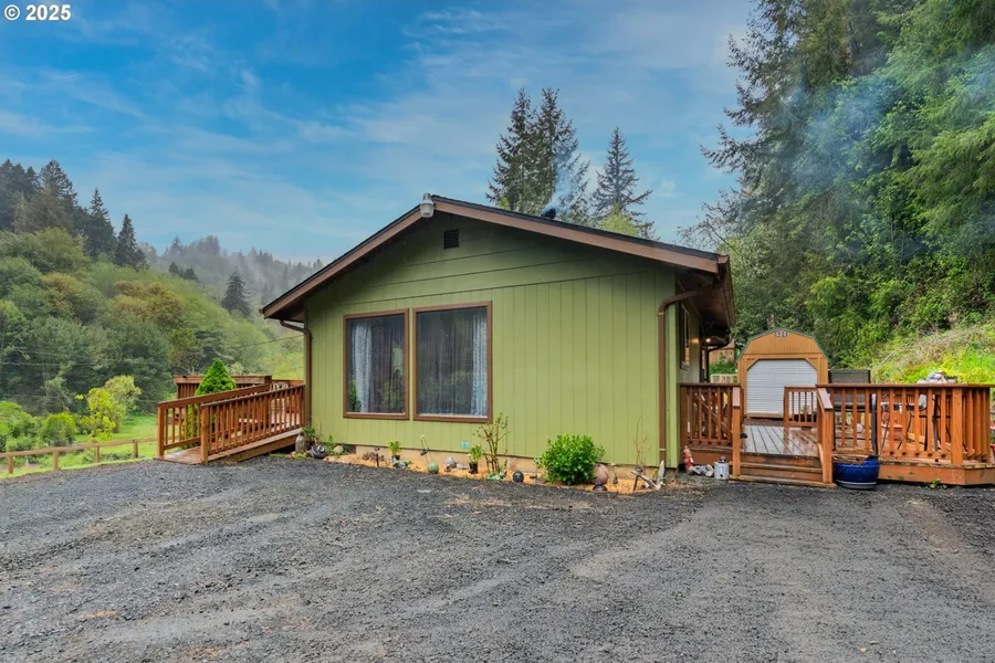 Nestled on over 2 acres of private, wooded land, this well-maintained country home offers peaceful valley views and a serene natural setting. The home features two spacious bedrooms (with potential for a third), a large bathroom with jetted tub and walk-in shower, and a bright kitchen with oak cabinets and ample storage. Enjoy outdoor living on two decks, surrounded by fruit trees-including apple, cherry, nectarine, and kiwi-and landscaped gardens nourished by a spring-fed water source. Recent upgrades include the detached 10x20 workshop, landscaping, fencing, and newer appliances. Additional highlights include raised garden beds, a fenced backyard, gated rear deck, wood stove and more. VA financing eligible.
