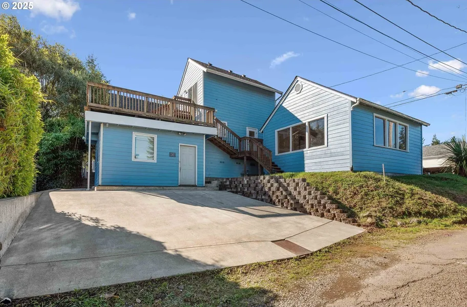 Beautiful 4BR, 1 Bonus Room, 3 BA home with a gorgeous deck featuring serene bay vista views on a corner lot centrally located in North Bend. Downstairs could be a separate living area with a large bedroom, living room, kitchen, bathroom, and utility room. Main living area has a nice living room, spacious kitchen, dining room, and a second utility room. Primary bedroom is upstairs with a bay view, deck, and bathroom with a jetted tub. There is a large detached garage and fenced front yard. This wonderful house has lots of possibilities. Duplex and short-term rental potential! A rare find and great property priced at only $550,000!