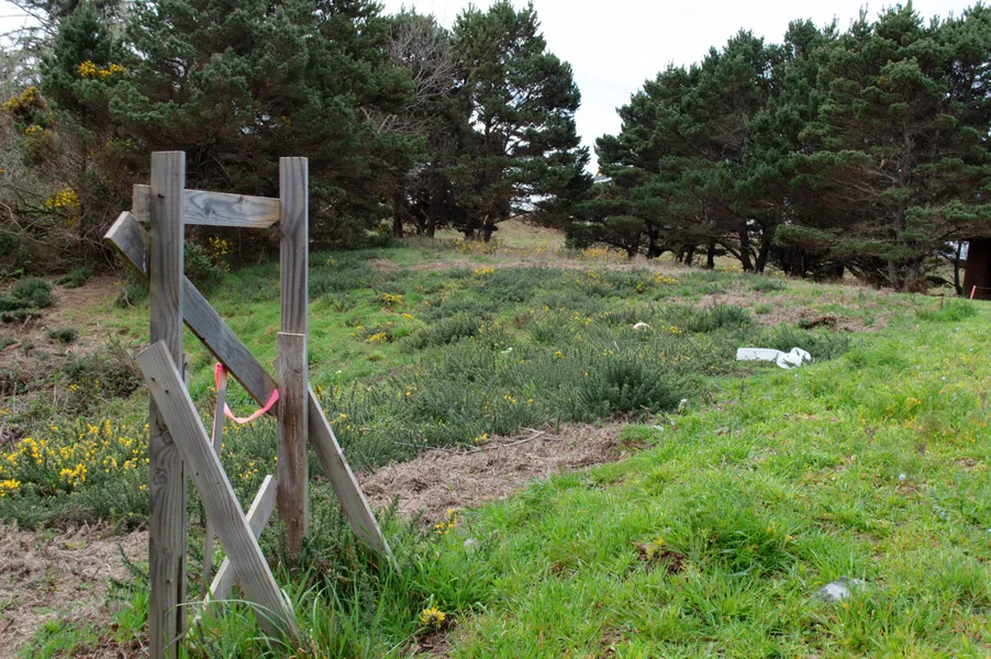 Driving Directions: From the center of Bandon, drive south on Hwy 101. Turn west on Seabird Dr. Take the first left on Natalie Way. The parcel is on the left. The entrance to the parcel is between the houses at 3375 and 3447 Natalie Way. Park on street and walk back between the houses, its OK. The orange cones behind the small gray outbuilding (owned by the neighbor) mark the approximate western border. The pink flag on the wood stick marks the approximate lot line with the neighbor to the south. Take the aerial map.
