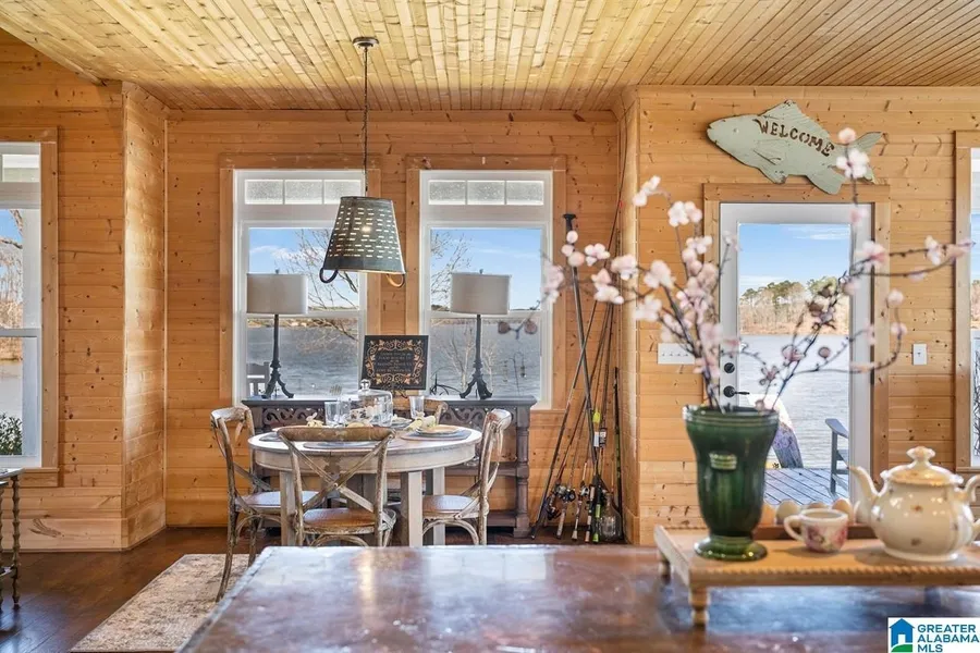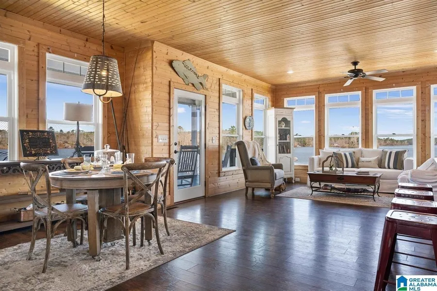 Lay Lake Estate Home- one of the most admired and talked about Lake homes on Lay! Point Lot with deep water & 1100'+/- of Shoreline! Natural serenity at its best with surrounding immense Lake views from every window! Experience seclusion & relaxation in this privately tucked away Lakeside Community- only 10 miles from Peach Park. Custom Build w/ 3100+/- Sq ft, 1100'+/- of Shoreline, 2.5+/- Acres, Main Channel, 2 Slip Boathouse/lift, 10X15 Swim Pier, 10X10 Storage on Boathouse, 16X20 Covered Pavilion over the water, 300 SF Boardwalk that leads to 300 SF Pier- 2 Green Monster Fishing Lights. 24X40 Covered Equipment Shed with new storm shelter. 5 Bedrooms & 2 loft guestroom areas allows for sleeping the largest of families and could serve as rec areas or teen space! Main level Master suite is designed to have screened deck access, newly added soaking tub in Master Bath Luxury retreat. New wood burning Fireplace in Great Room & revamped Pole Barn!