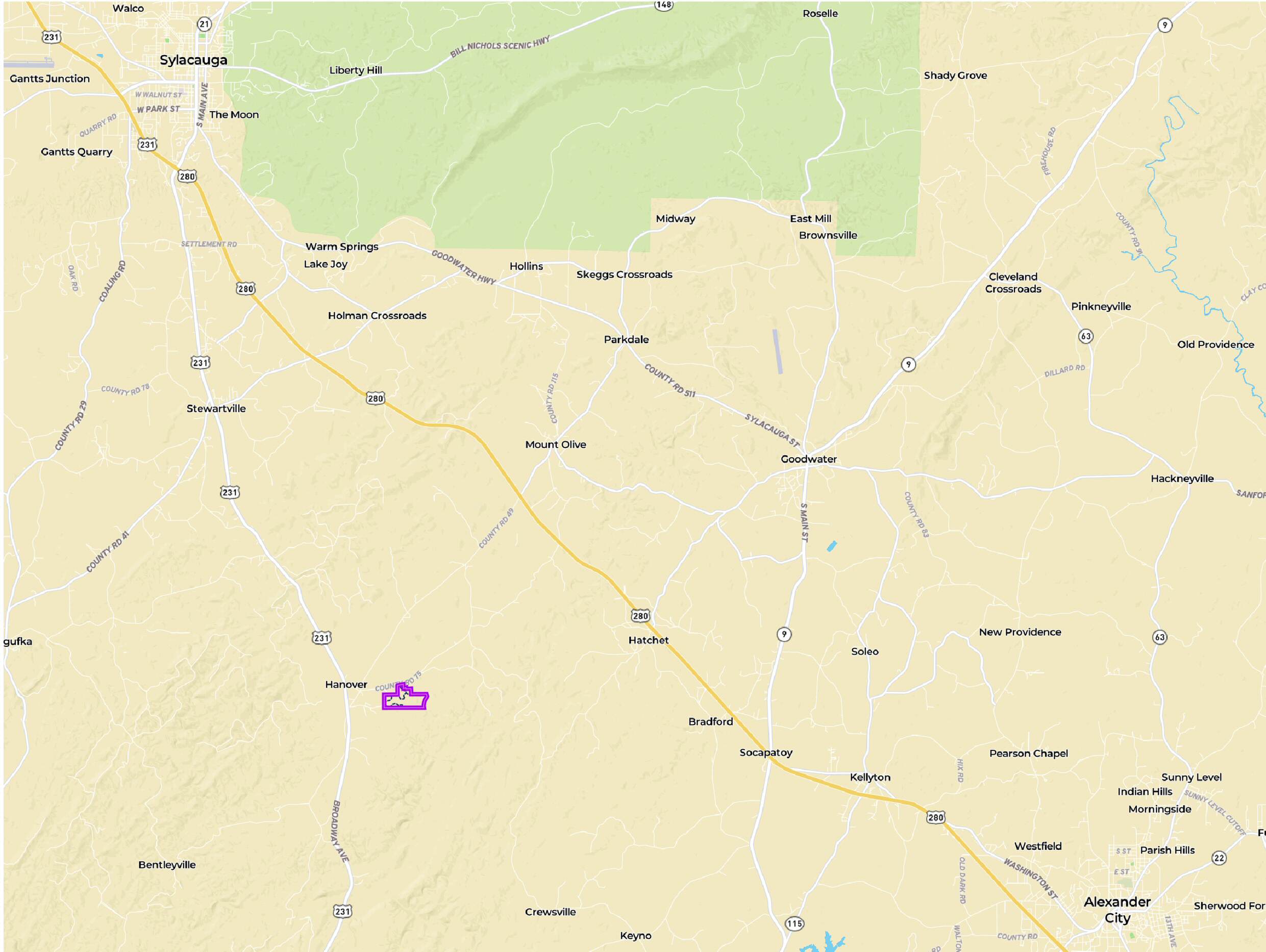 Located in north-central Coosa County, AL, near Sylacauga (15 minutes to downtown) and 60 minutes to Birmingham at I-459 and Hwy 280