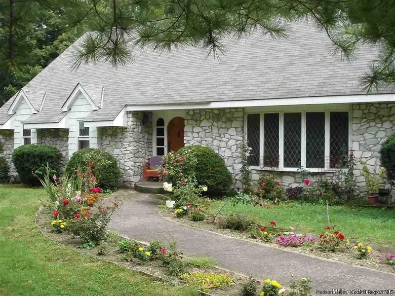 A charming secluded cape on 16+ acres of sunny, large lawns surrounded by forest on Cold Brook Road, one of Woodstock's most beautiful country roads. Generously sized rooms, foyer with marble floor and center hall staircase and marvelous stone fireplace in the living room. Large eat-in kitchen with glass doors to rear patio for lovely outdoor dining or to the firepit for fire flies and roasting marshmallows. Elements of the English style include coffered doors, arched doorways, bay and leaded-like windows and both wide and narrow hardwood floors. The semi-finished full basement has the same 1500 square foot imprint as the first floor and features a beamed ceiling room with a large river-stone fireplace-perfect for pool table/ game room/media room. Access to the basement through the interior of the house as well as thru the side door of the large 2 car garage. Near Woodstock Village and the Ashokan Reservoir, skiing at Bellayre and Hunter Mountains, and all the Catskills have to offer. Picture of pool is when it was fully operational some years ago....can fill in and use as an additional garden area.