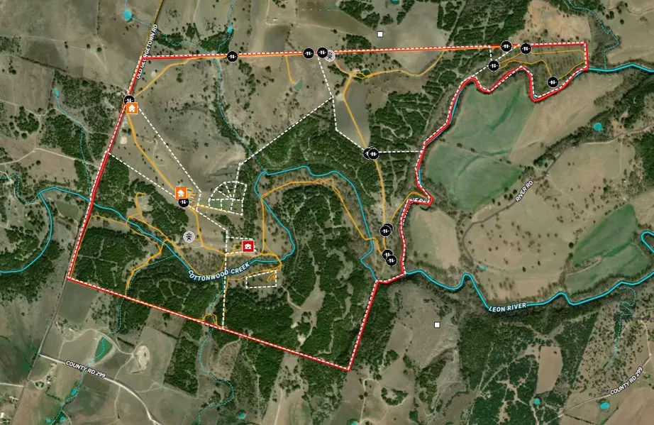 Cottonwood Creek Ranch is one of the premier Ranches for Sale in Texas! This property features approx. 1.5 miles of Leon River on the backside of the property and 1.5 miles of Cottonwood Creek running through the property. There is a large main house with a pool overlooking the river valley, a guest house near the front of the property, and a foreman's house near the barn on the property. The property is high fenced and set up for exotics with breeding pens and barns. This beautiful property is truly a one of kind.