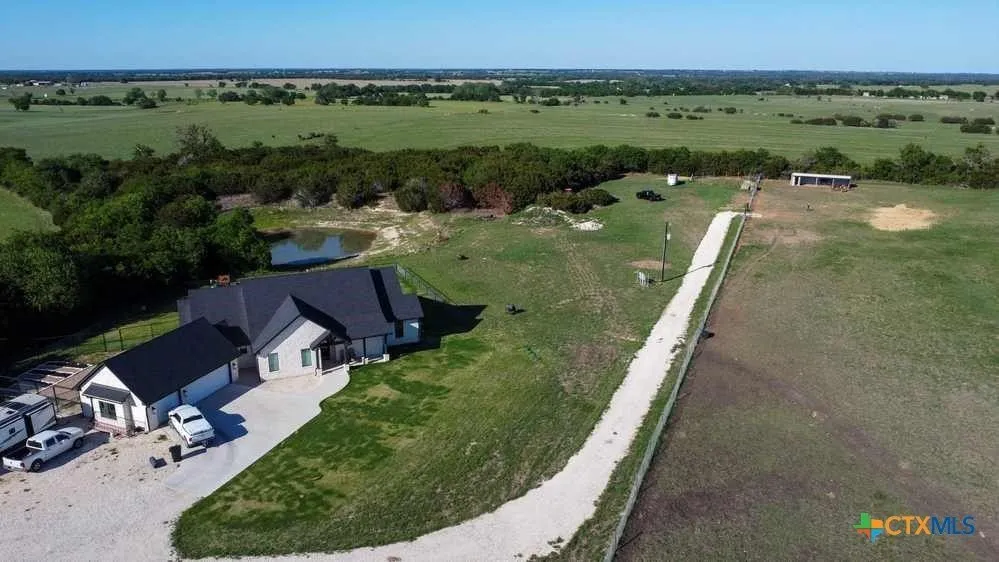Stunning custom home on 70.78 acres offers wide open spaces perfect for ranching, horses, or peaceful country living. Tucked off the paved road for privacy, the property features a seasonal creek, two ponds, and good fencing. Inside, enjoy top-tier design with custom cabinetry, an open-concept living area, and large windows showcasing breathtaking sunrises and sunsets. The main suite boasts dual walk-in closets, an oversized tiled shower, jacuzzi tub, and double vanity. Additional highlights include a private den with built-in cabinets, a huge pantry, large office, mudroom with sink, smart home features, heated bidet seats, foam insulation, tankless water heater, and RV hookup. Outdoors offers a covered back porch, pipe-fenced backyard, 8-ft fenced garden, and sprinkler system. With 12-ft ceilings in the living room, 10-ft ceilings in bedrooms, and handicap-accessible doors, this property blends luxury, functionality, and rural charm. Don't miss this incredible Texas retreat!