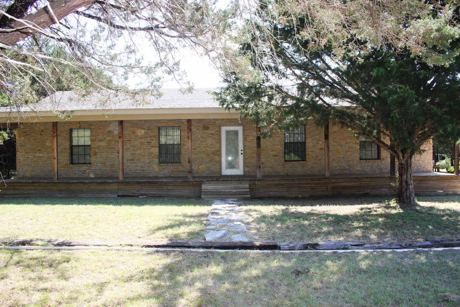 This Country Home for Sale in Central Texas is nestled amongst 22.8 secluded acres. The 1,900+ square foot home features an open floor plan with plenty of room for family gatherings. You will find hard wood floors, a wood burning stove, stainless steel gas stove, breakfast bar and plenty of natural light in the kitchen/dining/living area. The kitchen has oak cabinets and a large pantry. The French doors in the Master Bedroom open to the covered back porch that take in views of the natural park like setting. The Master Bathroom has a beautiful clawfoot tub, walk in tiled shower, double sinks, and plenty of closet space with two walks in closets in the Master Suite. The second bedroom has built in oak shelving and takes in views from the front porch which runs the length of the house like the back porch. The third bedroom is private and tucked away in the floor plan, sharing a full bathroom with the large laundry/utility room. The Laundry room has plenty of room for a freezer and has an abundance of built in cabinets along with a full-size sink. This home sits at the end of a long driveway, behind mature trees, making it the peaceful, secluded getaway that you have been looking for.
