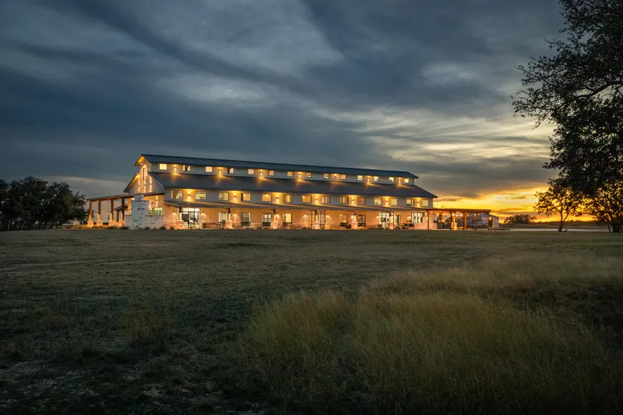 The primary lodge offers 2,500 SF of event space with retractable side doors and a glass front entry, accompanied by 8,200 SF of covered porches and an additional patio. Equipped with Wolf Commercial appliances, the lodge's kitchen features double ovens, a warmer drawer, built-in coffee maker, a commercial fridge/freezer, two dishwashers, and a wine fridge. It also includes two handicap-accessible guest rooms and an upstairs retreat with a small kitchen, living area, and two full baths. Harvey 5 Ranch has multiple indoor and outdoor entertaining sites, including a full bar both inside and outside, complemented by a large outdoor fireplace. The property accommodates guests with 10 cabins, featuring 1 and 2 bedroom layouts, full bathrooms, kitchenettes, and covered front porches overlooking the Leon River Valley. These cabins are solar-powered.