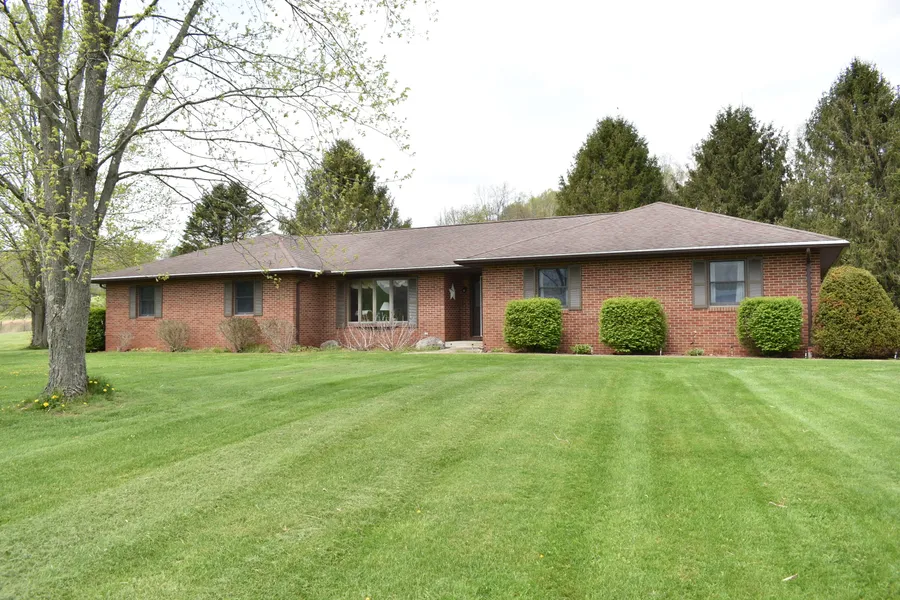 Great Location! Well maintained 3 bedroom, 3 bathroom brick ranch home on 8 acres. The home features on the main level, living room, family room with electric fireplace with stone wall, eat-in kitchen, laundry room, master bedroom with full bathroom, 2 other good sized bedrooms, and another full bathroom and a half bath next to the laundry room. The fireplace could be converted to gas or wood burning. There is a attached extra deep 2 car garage and plenty of parking outside as well and turn around area. Off of the back of the home is a trex deck with pergola covering the entire deck. The front of the house has a small covered porch. Located on the property is a 40 x 40 detached garage with cement floor and has 3 garage doors. The building has electricity and 2/3 thirds of it is heated. The front 3 acres of the property that runs along CR 23 is used by a neighbor to produce hay. There is small creek that runs along the west side of the property. The home is heated and cooled by geothermal that was installed in 2019. There is a whole house Generac generator that runs on propane that was added in 2014. Call today to schedule a private showing of this property.