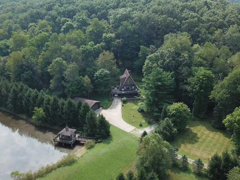 Improvements include a custom-built A-frame home or lodge nestled back in the valley overlooking the lakes, built in 1997. Home features walk-in lower level family room with an old town tavern feel, featuring a large stone fireplace, wet bar, and oak coffered ceiling. Bedroom, laundry room, full bath, utility room, and carport at this level. Main level features kitchen, dining area, living room with fireplace, full bath, two bedrooms, hardwood floors, and wraparound deck with panoramic views. The third level features a master bedroom with full bath, walk-in closet, fireplace, balcony with view, plus additional bedroom. Gas heat (free gas from owned well) and developed spring water. Home is very clean and well kept. Sells complete with all furniture, appliances, and furnishings. A must see! 24x48 detached garage/shop building. Truly a one-of-a-kind property ideal for a year-round residence, family, corporate getaway, or hunting buddys investment, you decide! Coshocton County parcel #0330000009800.