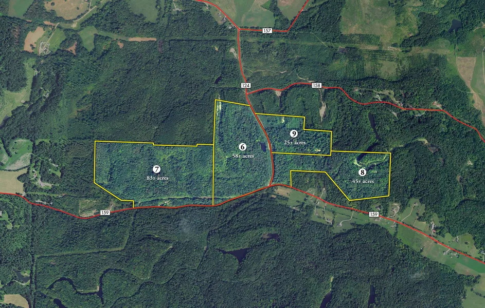Tract 6: 58 ac of mixed hardwood trees with road frontage on two roads, featuring two unique bodies of water. The first is a serene pond accented with cypress trees and the second is a long meandering body of water with high scenic rock walls. This is a great hunting/recreational tract or possible building site. Do not miss this opportunity to purchase a woodland tract with two unique bodies of water.