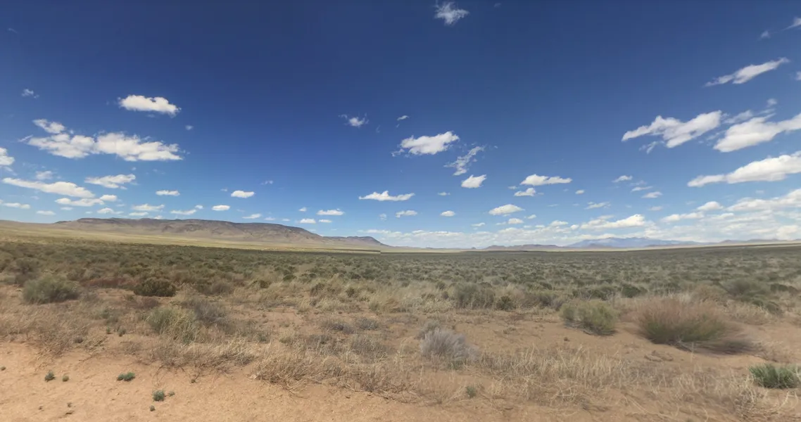 Terrain: Mostly flat, with ground vegetation and distant mountain views