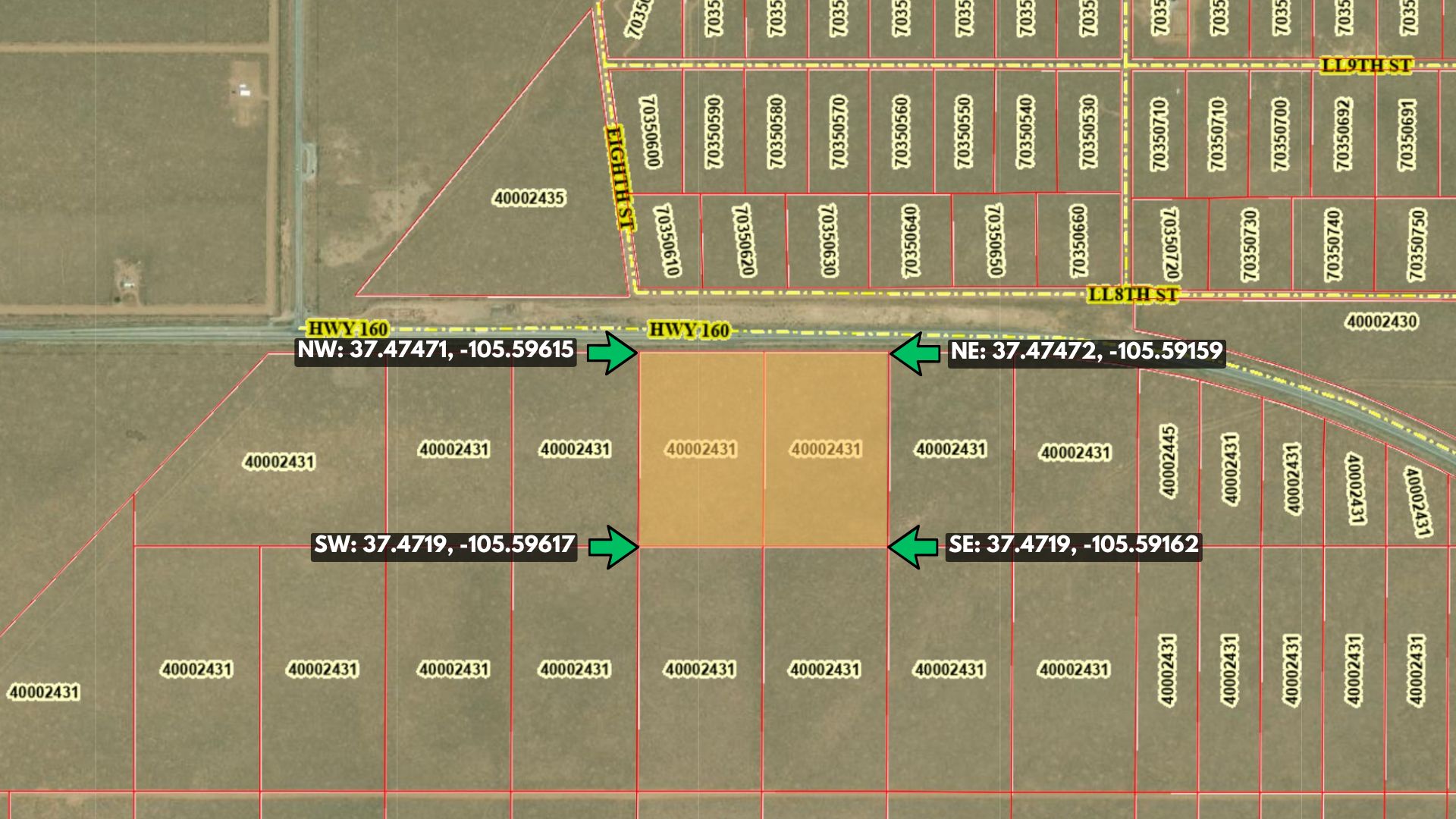 To visit this 31.01-acre double lot for sale in Costilla CO, search Lots A11-A12, U.S. Highway 160, Blanca, Colorado, 81123 within Costilla County on your phone. When you are near the land, search 37.47471, -105.59615 on Google Map to locate one of the corners. Contact our office for surveys (if available), county plat maps, Google Map boundaries and corners, and MapRight.