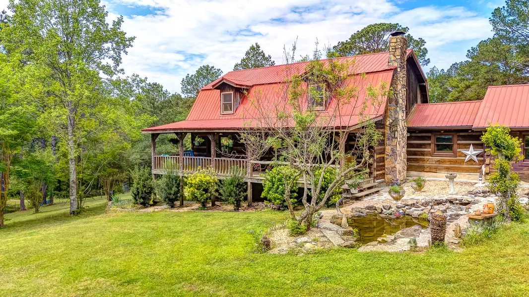 Rural living at its finest. Enjoy all the benefits of the country lifestyle on these 34 acres of pristine property just minutes outside of the City of Andalusia. A charming hand-hewn log home serves as the centerpiece with its welcoming front porch where one can unwind and enjoy the view of a year-round spring fed stocked pond. Step inside to discover a cozy interior adorned with exposed beams, wood floors, and two geothermal heating and cooling systems. The covered back porch offers the perfect place for outdoor entertainment of guests with its screened in pool.