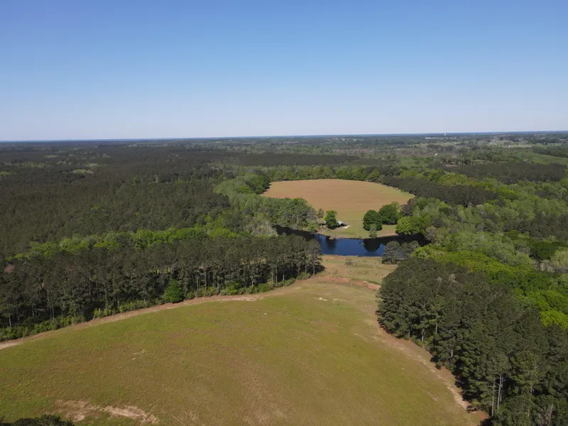 The layout and balanced diversity of this Farm make it a very special property. There is a three-acre pond between the two large fields with a large pole barn (60 x 48) next to the pond. Dry Creek (still not sure how it got that name) is a flowing creek full of cool water that is probably large enough to hold some native fish. With over 25 acres of row crop land under cultivation, you can grow plenty of supplemental food to attract and hold the wildlife or convert some of the farmland to pasture if you want to raise some livestock. Or you can continue to lease the fields to a local farmer for some supplemental income. There are 27 acres of freshly planted pines in the north and five acres in the SW corner. These pines were planted in early 2024 through the USDAs Environmental Quality Incentive Program (EQIP). The new owner receives all the benefits and proceeds from the thinning and eventual harvest of the trees but must agree to allow them to continue to grow to at least 15 years. In the future, these Longleaf pines could also be a candidate for a pine straw lease which would add an annual income stream to the investment.