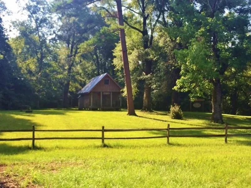 This cypress sided cabin sits on a small rise in the land, flanked by old growth pine and oak trees. The shaded front porch faces out over the hay field.....what a view! This cabin is an open concept design with a sleeping loft. It has a metal roof, wood-burning fireplace, electric appliances, community water and underground power across the hay field.