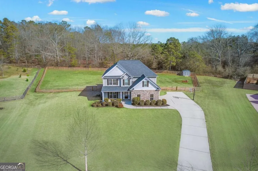 This 5BR/3BA home on a cul-de-sac lot is perfect for the summer as it is just up the street from the community lake where the owner has caught several fish! The main level features an open kitchen with custom cabinets, granite countertops, stainless appliances, double ovens, hardwood floors throughout the common areas, a guest room and full bathroom, and a mud bench entry from the garage. Upstairs you will find a large primary suite with a truly massive walk-in closet, updated primary bathroom, laundry room, and 3 more secondary bedrooms. The exterior is highlighted by a covered back patio with a wood burning fireplace and pre-wired mantle for game days, a large, flat, fenced-in backyard, and a storage shed. This home has been well cared for and the location is ideal for having a country feel, while still having close proximity to Downtown Newnan, Ashley Park, and I-85. Call today ...