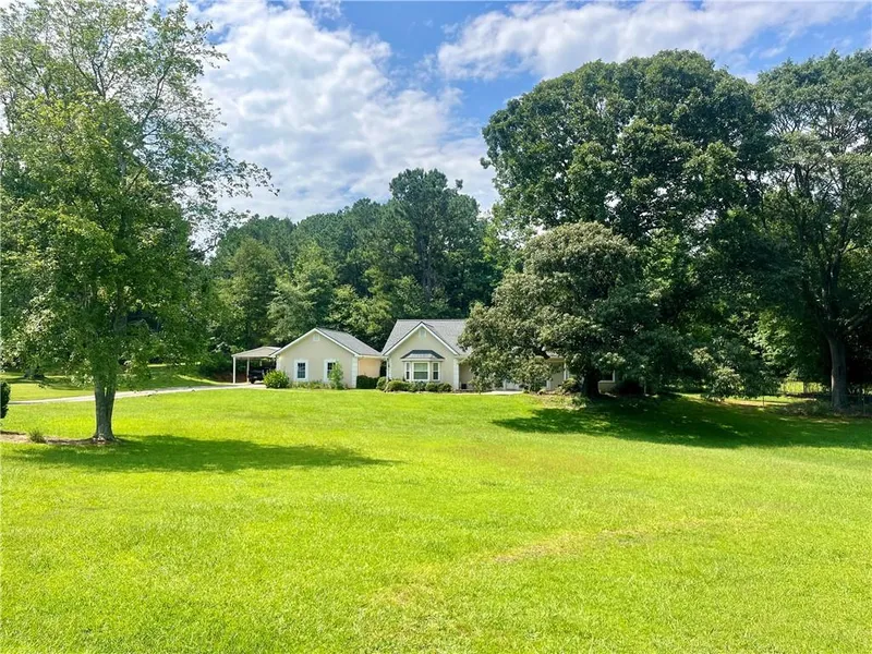 All you'll ever need! Perfect rural home just 30 minutes south of Atlanta offers one-level living and an exceptional lush manicured level yard. Inviting covered front porch ready for all your seasonal decor. Updated kitchen with substantial granite counter space, sustainable white tile flooring and white cabinets. Adjacent dining area with sliding glass doors lead to entertaining patio space in private backyard with private countryside view. Large living area has high tray ceiling and new luxury vinyl tile flooring accented with a grand floor-to-ceiling stone fireplace. Oversized primary bedroom has new carpet, tray ceiling, bay window, and double walk-in closets. Perfectly updated primary bathroom features double vanities and separate shower and soaking tub. New carpet installed in additional two spacious bedrooms with secondary bathroom in between. Separate laundry room off from kitche...
