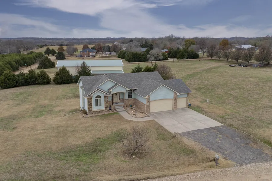 Just outside city limits-where you get all the freedom of country living without giving up convenience-this custom-built beauty sits on 1.6 acres and delivers the perfect blend of peace, space, and practicality. Whether you want room for animals, room to breathe, or room to spread out and enjoy life without neighbors hovering, this property hits the mark the second you pull in. And let's talk about the showstopper: the 80*40*16 insulated shop. This isn't just a shop-it's a lifestyle upgrade. With a 6-inch concrete floor, four overhead doors that include two 14-ft drive-through bays (yes, bring the RV, the boat, the hauler... even the semi), plus 10-ft and 8-ft doors, this space is built for big toys, big projects, and big possibility. A covered patio right off the shop sets you up for easy evenings with friends after a day of tinkering or adventuring. Then there's the home-custom built in 2008 and designed for comfortable, everyday living with nearly 2,800 sq ft of well-planned space. The open kitchen, dining, and living area makes the heart of the home feel warm and inviting, perfect for hosting or keeping everyone connected. On the main level you'll find a split master floor plan that gives privacy where it counts. The spacious primary suite features a true walk-in closet, double sinks, a separate tub and shower, and plenty of room to unwind. Two additional main-level bedrooms and a full bath sit on the opposite side, keeping things quiet and functional for the whole household. Step out either of the sliding doors to enjoy the covered patio or the wide-open backyard-your own private 1.6-acre retreat ideal for pets, play, and peaceful nights under the Kansas sky. Head downstairs and the finished basement opens even more possibilities with a large family room, bonus flex area, a fourth bedroom with private bath access, laundry/utility room, and an unfinished wet bar/kitchenette area ready for your custom finishing touches. A new roof installed in February 2025, a 3-car attached garage, and an optional additional 2.4-acre parcel across the street (listed separately) round out this one-of-a-kind package. If you've been craving space, freedom, and a property that finally checks every box-this is the one. Come see why life feels better out here.