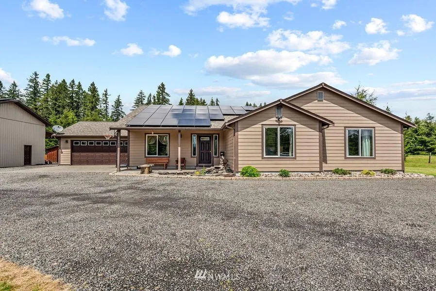 A little of everything! This is a beautifully maintained home & grounds. Home has many updates throughout. 3 spacious bedrooms, plus a master w/ full bath & walk in closet. Nice open floor plan, kitchen opens to the great room, cozy free standing wood stove, formal dining & wet bar for entertaining. Home is powered w/solar & electric. Seller has banked power ( NO Power Bill). Lots of parking, circular driveway, shop w/carport, covered back patio, great enclosed garden area, chicken/ pet pen & extra storage. Home comes wired for a generator. All this is flat usable acreage. Pleasure to show!