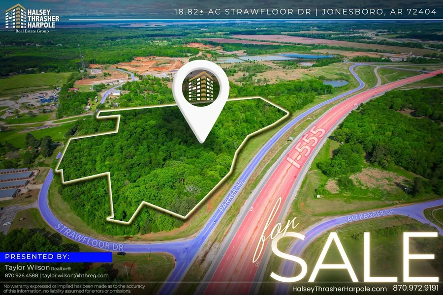 This 18.82± acre tract on Strawfloor Drive offers a rare development opportunity in Jonesboro’s rapidly growing Western Residential District. Featuring frontage along Parker Road and Strawfloor Drive with excellent visibility from Interstate 555, the property benefits from strong daily traffic counts of over 21,000 CPD on I-555 and 4,100 CPD on Parker Road. Zoned R-1 and C-3, the site allows for versatile residential, commercial, or mixed-use development. Its wooded landscape provides a blank canvas for investors and developers seeking to capitalize on the area’s continued growth and accessibility to schools, retail, healthcare, and Arkansas State University.