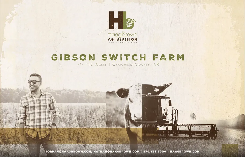 Haag Brown is proud to offer the Gibson Switch Farm, which consists of approximately +/- 115 acres of row crop farmland located in Craighead County, Arkansas. The Farm is conveniently situated 8 miles southwest of Jonesboro and 6 miles east of Cash between HWY 226 & 49. The Farm is split into two tracts, with the north tract consisting of +/- 60.19 acres and the south tract consisting of +/- 54.8 acres.