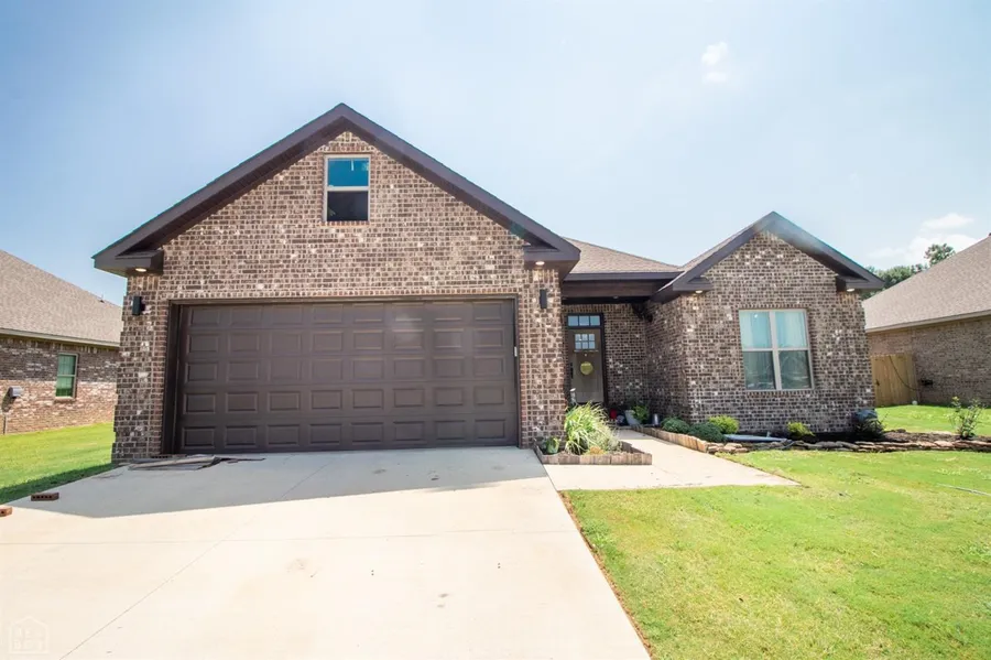 Step in a beautiful custom all-brick home located in the kid friendly neighborhood of East Hills in Bono. Upon entering, you are greeted with the open split floor plan and 15' vaulted ceilings that are highlighted with the rustic trimmed gas fireplace and solid wood ceiling beam. Acid stained floors are throughout the home for easy care and durability. The kitchen is definitely one to desire with the gas cooktop, built-in wall oven and microwave all surrounded with granite countertops. The master bedroom is ready for your furniture and the master bath is a place to relax and wash away the day with the options of tub or custom tiled shower. Across the house are two more oversized bedrooms and a second full bathroom. The HVAC system is a major upgrade with 95+ Gas 5-ton system that provides electric cooling and gas heat. The gas water heater is a luxury with the full home circulating system to provide hot water when it's needed. Garage is oversized to fit those extra large trucks and it's insulated too. Stepping out back there is a fully covered back patio with great county views.