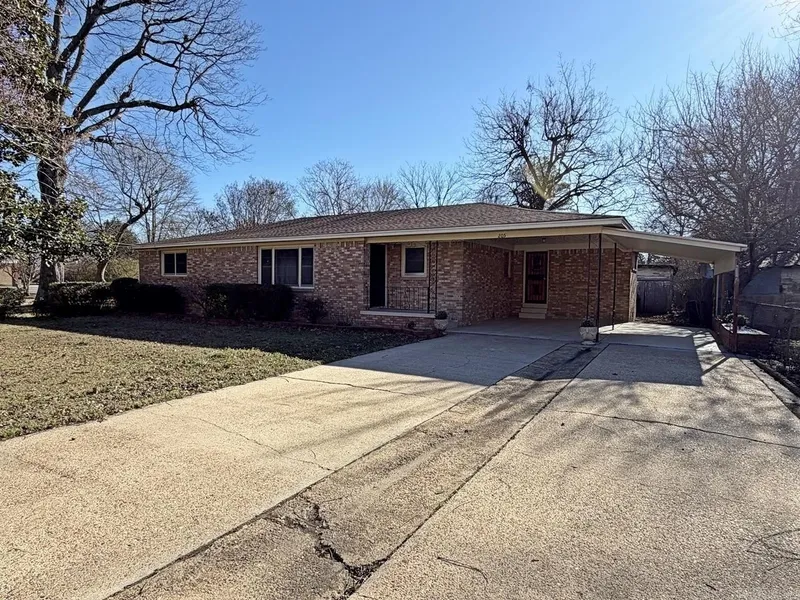 This charming 1960's mid-century modern all-brick ranch home is in pristine condition and built with excellent craftmanship. Much of the original charm has remained and has been lovingly cared for. It has a very roomy and efficient layout which offers a generous living area and dining room combination, a nice eat-in kitchen with well-crafted cabinets, a oversized laundry room, private dedicated office, three bedrooms, and two full baths. Some walls are clad in hardwood paneling. Beautiful hardwood floors are throughout most of the home, with newer tile floors in the kitchen and laundry, vintage tile in the bathrooms, and carpet in one bedroom. Recent updates included newer heat and air, and new architectural shingled roof in 2023, providing comfort and peace of mind for years to come. Situated on a large lot, this home features a 20' x 25' shop building with a roll-up overhead door perfect for hobbies, projects, or extra storage. A two-car carport is located on the side of the home. Don't miss out on this well built charmer!