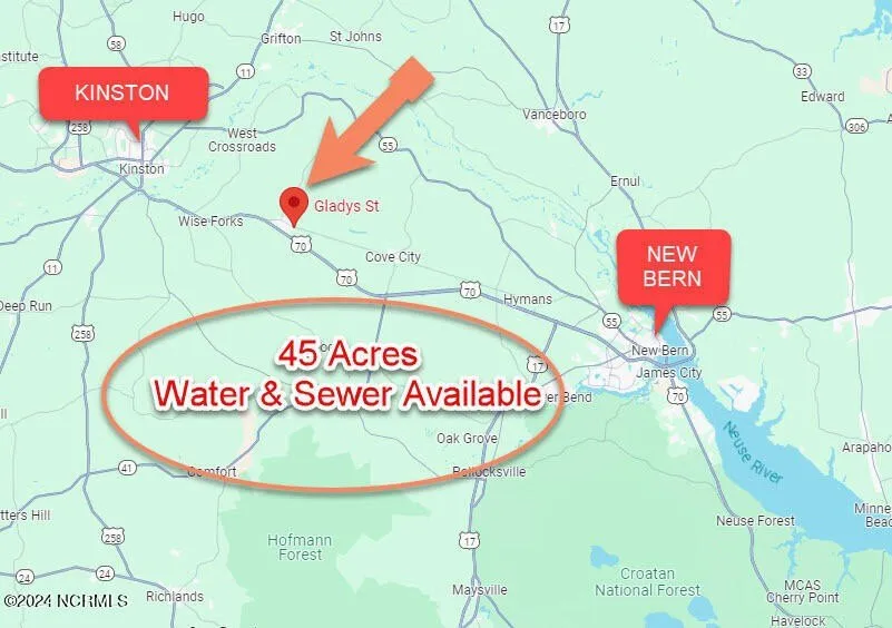 Prime land and the perfect getaway for anyone wanting easy access to New Bern or Kinston. Close to the Global Transpark and the Craven County Industrial Park. WATER AND SEWER IS AVAILABLE to the property. Own your own farm, hunting preserve with room to roam or start you own subdivision. Sale includes 2 parcels, 3-D-04-021 & 3-D-04-009, 125 Gladys St & Old US 70.