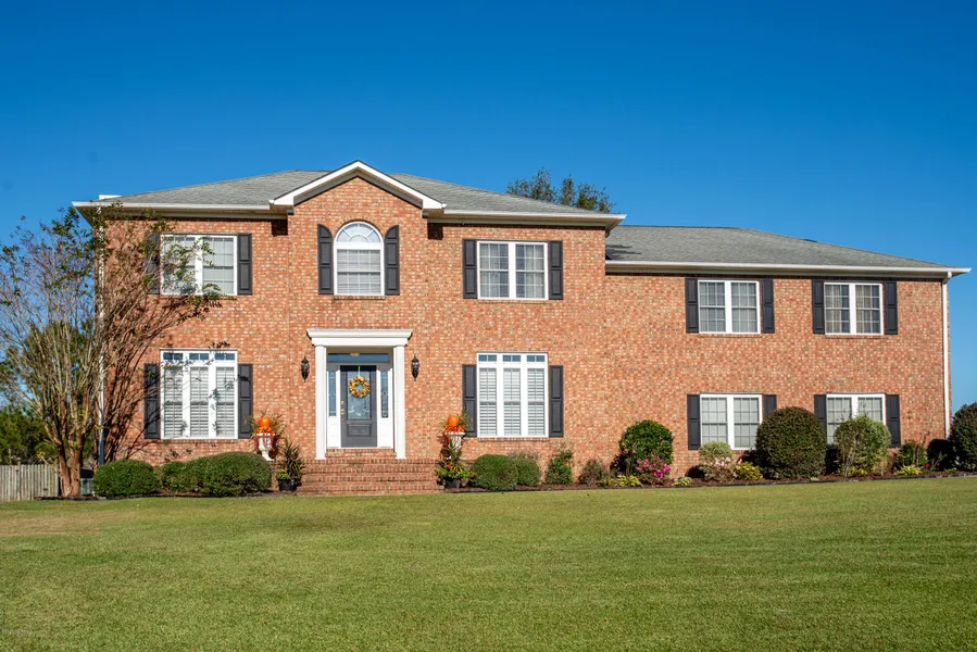 Spacious home in desirable Hunters Ridge subdivision that only has County taxes yet is close to Cherry Pt MCAS, downtown New Bern, area airport, shopping, medical and more. As you enter this home you have a formal dining room, spacious family room with fireplace, open kitchen with island, pantry, lots of cabinets and sunroom with built ins that overlook a pond. The master en suite has a a separate tub and shower, double vanities and spacious closet. There are 3 additional bedrooms, an office with closet and a family room with double closets, together with 2 full guest baths upstairs.There is also permanent stairs that lead up to an attic with lots of storage space. The laundry room is spacious and has a full bath just off of it. This home has an attached double car garage and a detached garage with permanent walk up stairs. There is also a shed that can be used to store garden tools, etc...