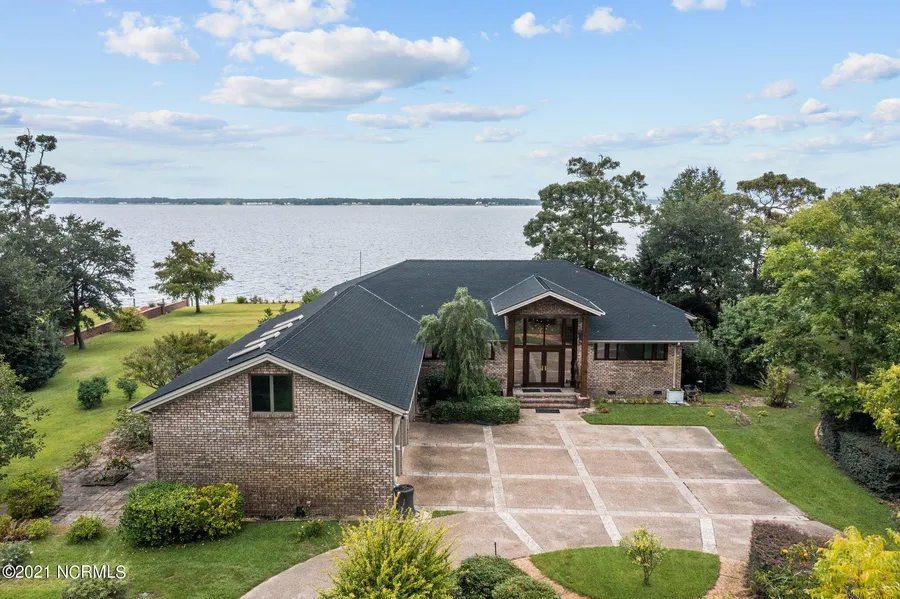 Custom architectural designed ''Acorn Deck Home '' on 1.69 acre waterfront lot in the popular Cherry Branch West subdivision. Enter the home through the mahogany columns and covered porch. A slate floored foyer leads to a massive great room/dining room that features a wall of windows over looking the Neuse River where the ferry boats cross. There is a built in smart TV over the gas fireplace on a special swivel that can also be viewed in the master. Original oil paintings slide and cover the TV when not in use. The chef's kitchen has 3 ovens, a 2 drawer dishwasher, trash compactor, granite topped island with glass cooktop with automatic vent fan., wet bar and large walk in pantry. Master bedroom also features a wall of windows with more great water views. The master bath has a walk in shower and air jetted tub. The CA style closet has 3 levels of racks and 10 levels of shelves. Media room has built in secretary with granite top, gas logs, TV and a whole house media/control closet. This TV also has a oil painting to conceal it when not in use. The second floor large bonus room has 4 screened skylights and plenty of storage. There are red oak hardwood floors and doors throughout the home. All cabinets are hickory with crystal knobs. The ceilings on the main level are cedar, oak and mahogany. Do not worry about the power going out because there is a whole house generator. There are 2 tankless gas hot water heaters with separate controls. All closets on main level are CA style Enjoy entertaining on the large tiered trex deck with built in hot tub or stroll through the lush gardens with numerous fruit trees. Irrigation system covers all areas of the yard. Convenient to MCAS Cherry Point, historic downtown New Bern and local Crystal Coast beaches.