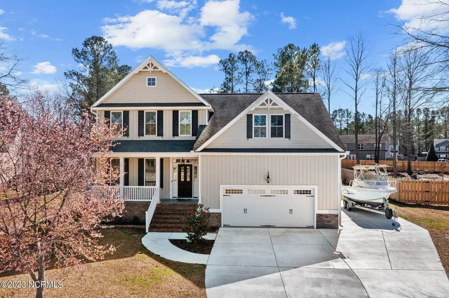 Craftsman style home with county taxes only. As you enter the address of this home, you will find plenty of paved parking for vehicles or even space for a basketball court. Place your front porch furniture and enjoy the cul de sac privacy with little traffic. The front door leads you to a space that can be a formal living room, formal dining room or your choice of designated space. The kitchen is open to a breakfast nook and den area that flows to a screened porch overlooking a spacious backyard. All the kitchen appliances convey as well as the washer and dryer. The kitchen features granite countertops, custom cabinets and walk in pantry. The master en suite has tile flooring, double vanities, separate shower and soaking tub. The master closet has lots of space and is connected to the downstairs laundry room for convenience. There is a downstairs 1/2 ba for guest and privacy too. Upstairs features 2 bedrooms, full bath and a loft area and also has a newly finished bonus room with full bath and office nook that could be converted to a closet to have a 4 bedroom home. This bonus room has multiple eave storage spaces and 2 wall units that can be controlled with a remote. The garage has an extra space that can be used as a workshop. This home features natural gas that services the downstairs heat, tankless water heater and gas logs. Easy commutes to Cherry Pt MCAS, Camp Lejeune and offices, etc in New Bern.