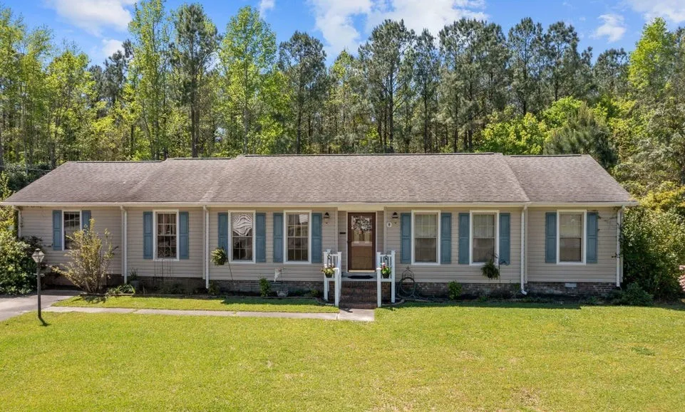 This adorable ranch with nearly a half acre lot is on a quiet dead end road in the desirable Carolina Pines neighborhood. Featuring 3 bedrooms, 2 bathrooms, a formal living/sitting room in addition to a family room, separate dining room and a huge partially covered back deck perfect for entertaining. The family room has exposed beams and a brick fireplace with gas logs. The entire main living space has beautiful hardwood floors. The hall bathroom has a custom tiled bathtub surround and a large double vanity. The garage was converted to a large flex space (included in square footage) with it's own mini split heating & cooling unit. This home has not one, but TWO large detached workshops perfect for extra storage or hobbies. No HOA and no City taxes here! This property backs up to over 160 acres of woods owned by a land trust, giving it a ton of privacy. Centrally located, less than 10 minutes away from USMC Cherry Point, 15 minutes to downtown New Bern and 40 minutes to the Crystal Coast Beaches. 5 minutes to Flanners Beach/Neuse River campground where you can enjoy camping, hiking, biking, picnicking and the great outdoors. The Neuse River is just a few blocks away. New Bern is North Carolina's second oldest town, founded in 1710. You'll love the town's rich history and idyllic downtown.