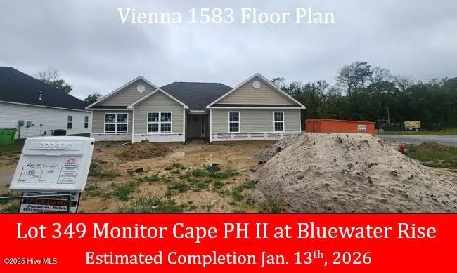 ''Vienna 1583'' floor plan in Monitor Cape Phase of Bluewater Rise. $10,000 buyers closing cost assistance with use of preferred lender & closing attorney. This impressive split floor plan features a large family room w/ gas log fireplace, Vaulted ceilings, granite counter tops, & a spacious master bedroom suite w/ private bath & walk-in closet. Quick commute to Cherry Point MCAS and Downtown New Bern.