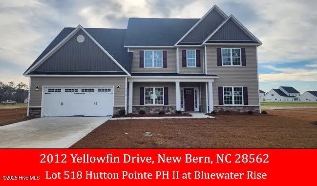 The ''Bailey'' floor plan is nearing completion in the highly desirable Hutton Pointe section of Bluewater Rise, offering an exceptional opportunity for buyers searching for a spacious new construction home in New Bern, NC. This impressive property features 4 bedrooms, 3.5 baths, and nearly 3,600 heated square feet, including a first-floor primary suite, an upstairs loft, and a bonus room with closet, providing flexible space for a home office, playroom, or guest area. The modern kitchen is designed with granite countertops, a breakfast bar, and a sunny dining nook that opens to a covered back porch, perfect for outdoor living. Located in the sought-after Creekside School District, this home is close to shopping, dining, Cherry Point MCAS, and historic downtown New Bern. The builder is also offering up to $10,000 in closing cost incentives with the use of the preferred lender and attorney, making this an incredible value for buyers looking for new construction in a growing community.