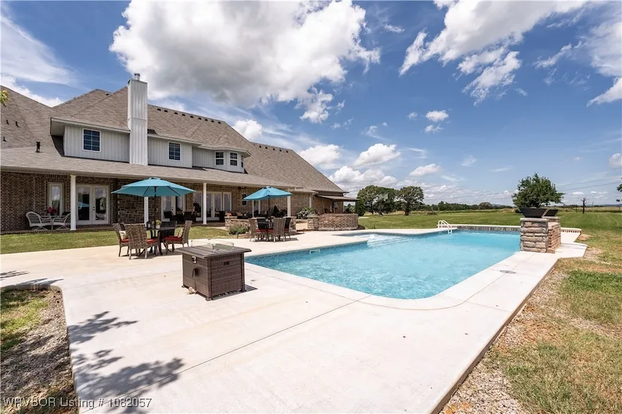 Stunning Custom Estate with Panoramic Views on 5 Acres!If you're searching for space, luxury, and unforgettable views this 7,300 sq ft custom home delivers. Set on 5 open acres with a backdrop that feels like 100, this property is made for relaxing, entertaining, and living large. A brand-new resort-style pool (2024) features a diving ledge, sheer waterfall, fire bowls, LED lighting, and heater for year-round enjoyment. Inside, you ll find 6 bedrooms including two main-level primary suites plus 5 full baths and 2 half baths. Highlights include a game room, theater room, potential gym, and library or office. The chef s kitchen offers two built-in refrigerators, walk-in pantry, and a large range, flowing seamlessly into the open family room. Near the theater, a bar area leads to a walk-in wine room with floor-to-ceiling storage. The main primary suite is a luxurious retreat with a double-sided fireplace, sitting area, oversized walk-in closet with built-ins, spa-style bath with double shower heads, soaking tub, and dual vanities. The second suite also includes a full bath and walk-in closet. Upstairs, one bedroom is nearly 800 sq ft with three closets and a private bath. Another ensuite bedroom overlooks vineyard views. The theater room includes a built-in storm shelter for peace of mind. The 5-acre lot is mostly grass, perfect for outdoor activities. From the covered back porch, enjoy peaceful mornings and stunning sunsets over sweeping open views. This one-of-a-kind home offers unmatched comfort, space, and style don t let it pass you by!