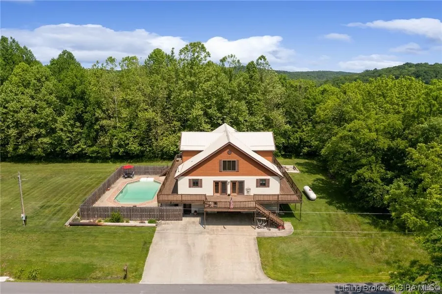 MOTIVATED SELLER!!! This beautiful home sits right next to PATOKA LAKE and borders the HOOSIER NATIONAL FOREST and offers some breathtaking views and plenty of opportunities for outdoor activities. With over 5000 sq. ft. of living space on three levels provides lots of space for families! This home features 2 full kitchens and 3 full bathrooms and 4 bedrooms. It has lots of features to offer. The game room is perfect for entertaining or enjoying some indoor recreation. This home has tons of walk-in closets and storage. Separate space downstairs that would make a great in-law suite or possible rental. The brand-new washer and dryer, along with all kitchen appliances, is a nice bonus. The property's natural lighting and wrap-around deck create a bright and inviting atmosphere. This home includes custom built-in shelving, a walk-in pantry, and windows galore. There is an underground dog fence. The outdoor features of the property are equally impressive. Splashing around in the 20x40 saltwater pool and gathering around the fire pit for campfire stories is a fantastic way to enjoy the outdoors. The massive, heated detached pole barn garage with ample storage, along with the covered lean-to, provides even more space for vehicles and equipment. This property offers a fantastic blend of natural surroundings, spacious living areas, and desirable amenities with being only 20 minutes from the casino & resort. Sq. ft. is approx.